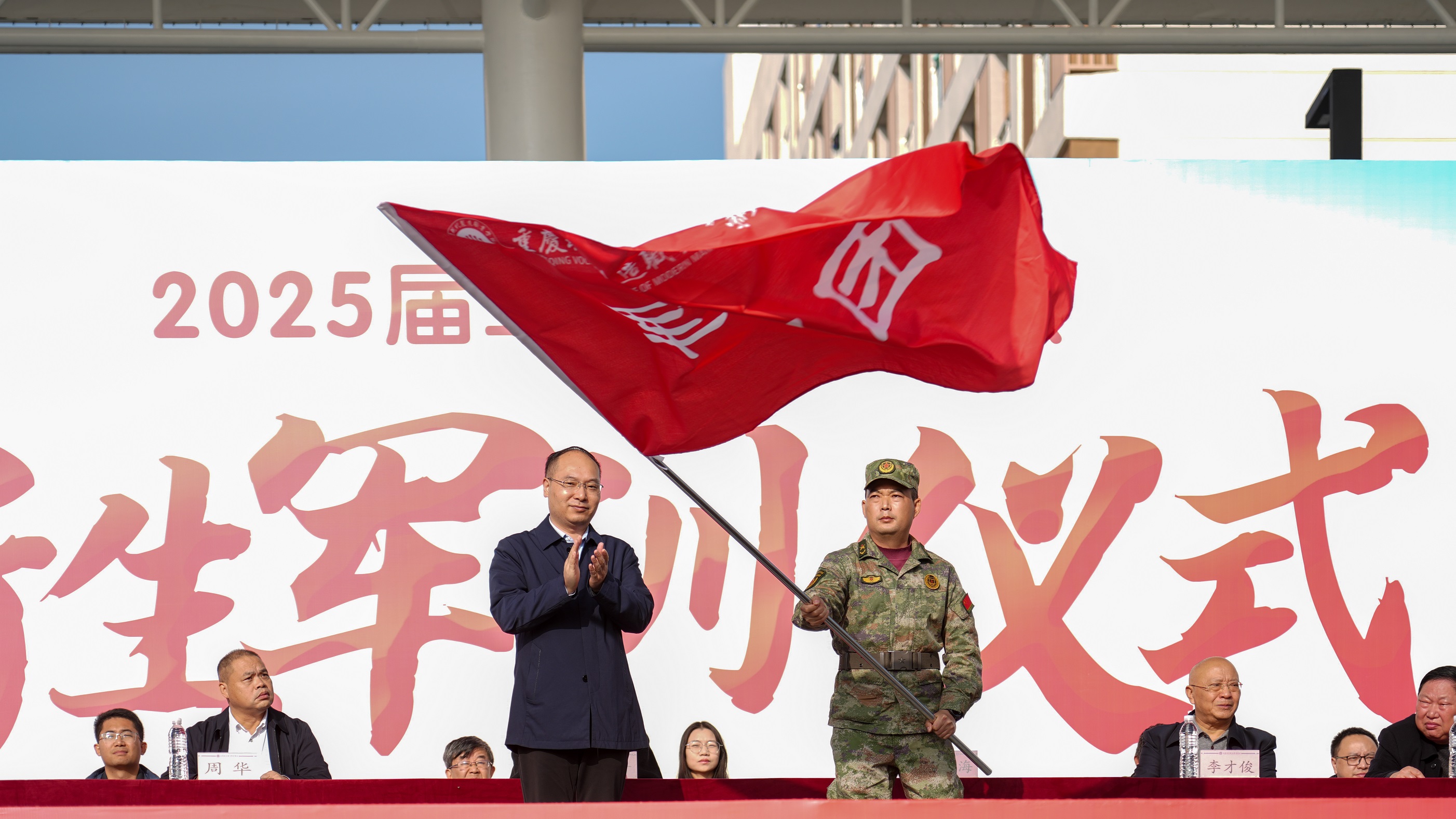 随后,学校党委书记雷道海为2025级新生军事训练团授旗,军训团总教官刘波接旗。旗帜的传递,象征着军训任务的正式启动,也承载着学校对全体参训学生的殷切期望。